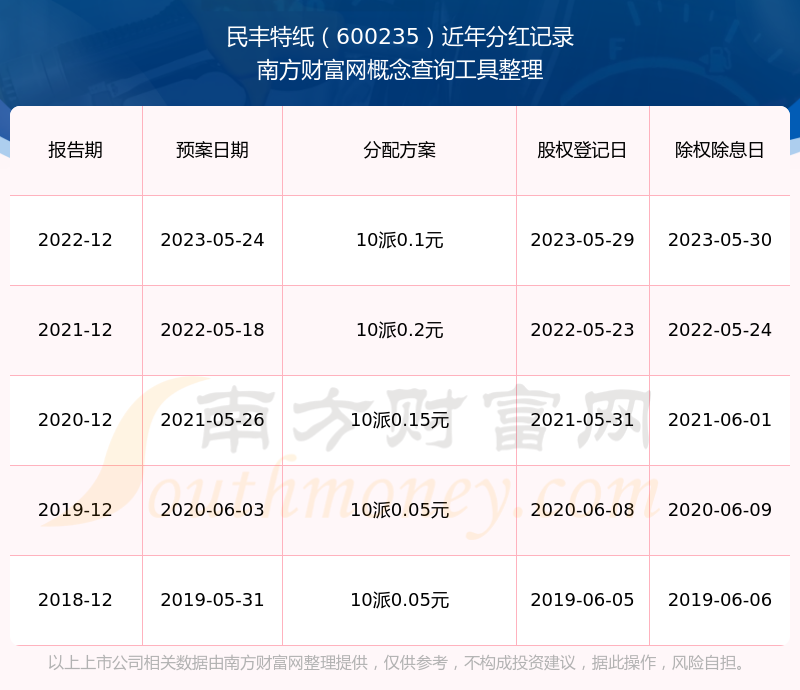 民豐特紙最新一次公布的分紅方案為10派0.1元。本次權(quán)益分派股權(quán)登記日為2023年5月29日,除權(quán)除息日為2023年5月30日,派息日為2023年5月30日。