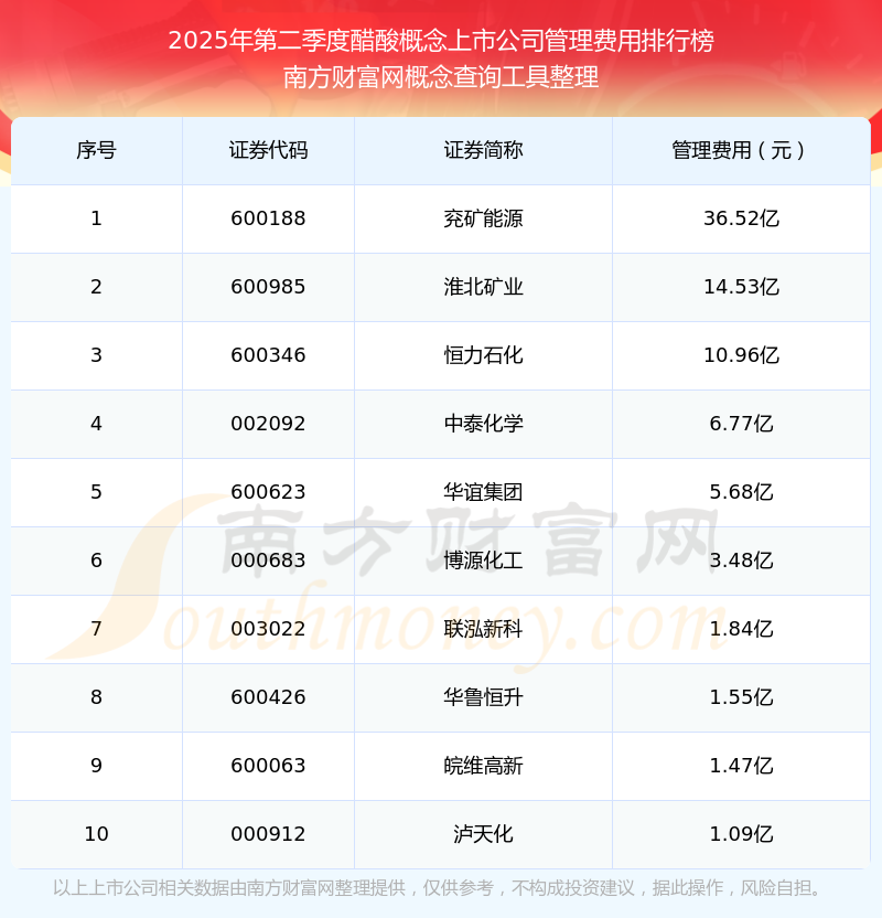 2025年第二季度,醋酸概念上市公司管理費(fèi)用排名如下:兗礦能源(600188)的管理費(fèi)用總額高達(dá)36.52億,淮北礦業(yè)(600985)和恒力石化(600346)位居第二和第三,中泰化學(xué)(002092)、華誼集團(tuán)(600623)、博源化工(000683)、聯(lián)泓新科(003022)、華魯恒升(600426)、皖維高新(600063)、瀘天化(000912)分別進(jìn)入前十,其管理費(fèi)用總額分別排名第4-10名。