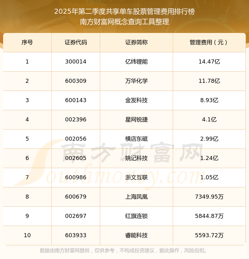 2025年第二季度,共享單車股票管理費用排行榜中,億緯鋰能(300014)的管理費用總額高達14.47億,萬華化學(600309)和金發(fā)科技(600143)分別位居第二和第三,星網銳捷(002396)、橫店東磁(002056)、姚記科技(002605)、浙文互聯(lián)(600986)、上海鳳凰(600679)、紅旗連鎖(002697)、睿能科技(603933)分別進入前十,其管理費用總額分別排名第4-10名。