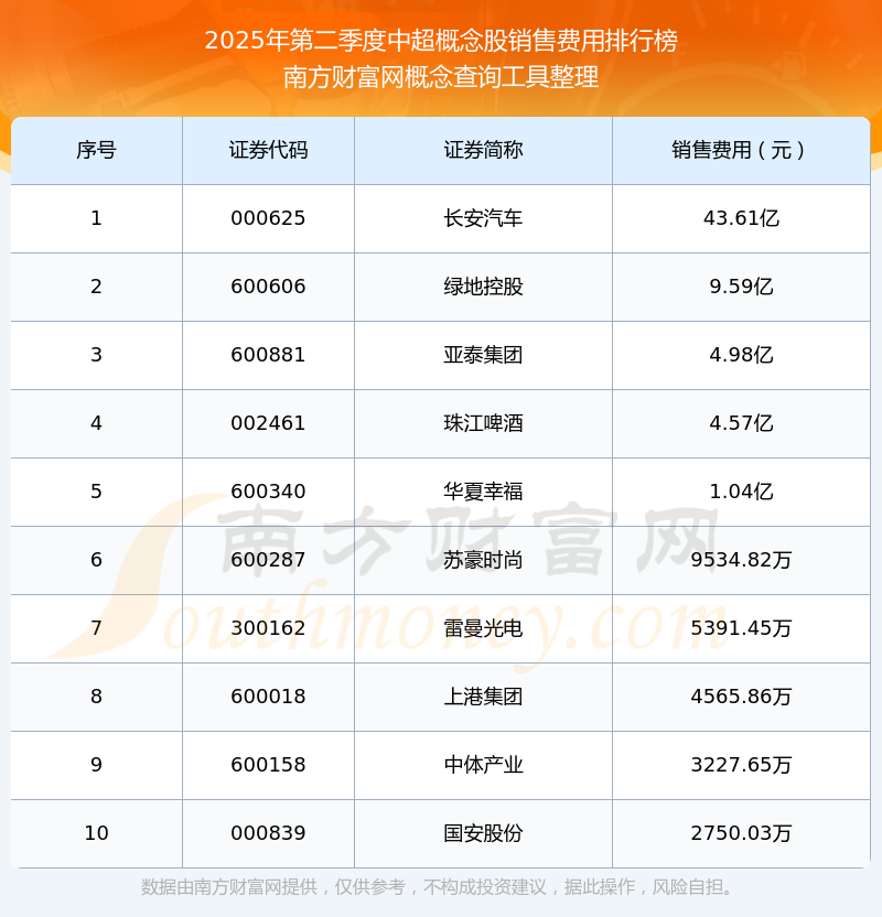 中超概念概念股十大排行榜:2025年第二季度銷售費(fèi)用前10榜單