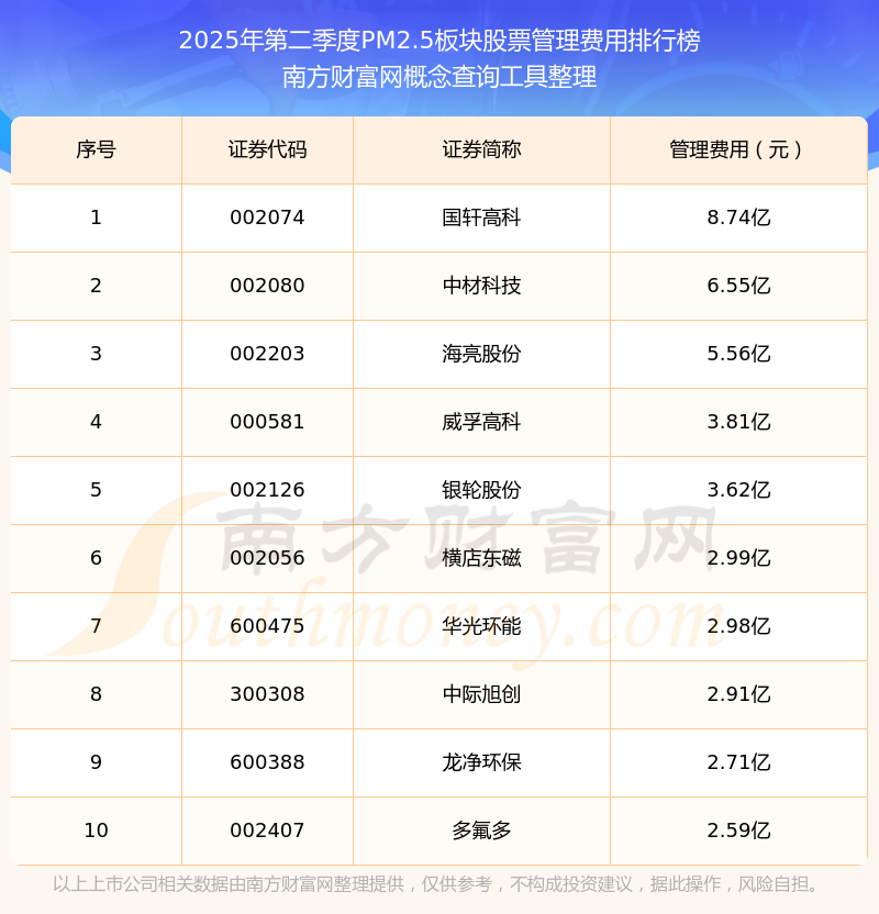 2025年第二季度,PM2.5板塊股票管理費(fèi)用排行榜中,國(guó)軒高科(002074)的管理費(fèi)用總額高達(dá)8.74億,中材科技(002080)和海亮股份(002203)分別位居第二和第三,威孚高科(000581)、銀輪股份(002126)、橫店?yáng)|磁(002056)、華光環(huán)能(600475)、中際旭創(chuàng)(300308)、龍凈環(huán)保(600388)、多氟多(002407)分別進(jìn)入前十,其管理費(fèi)用總額分別排名第4-10名。