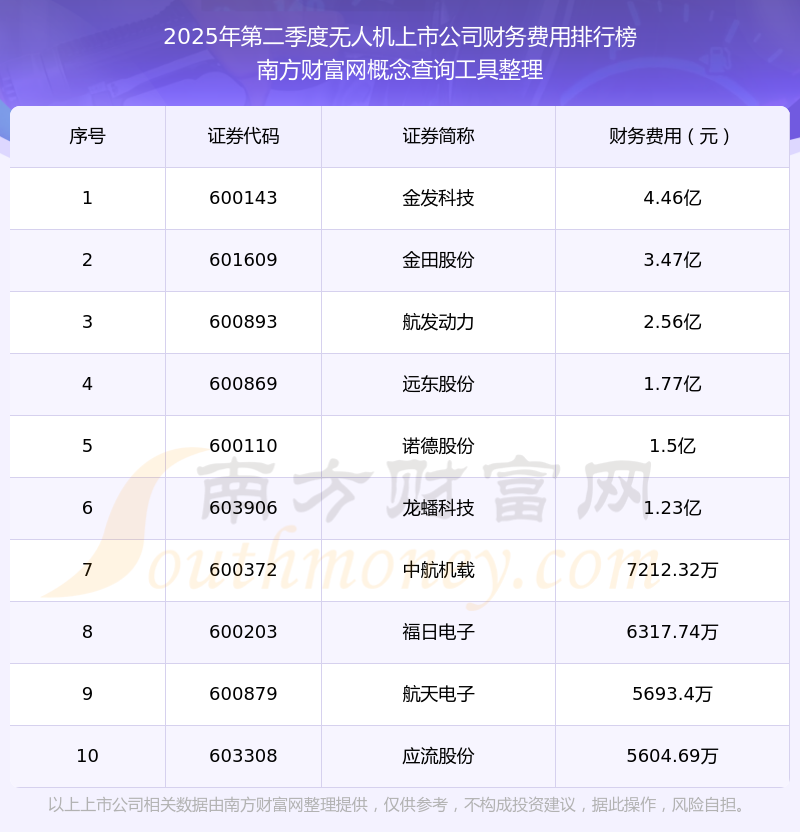 2025年第二季度無(wú)人機(jī)上市公司財(cái)務(wù)費(fèi)用排行榜如下:金發(fā)科技(600143)的財(cái)務(wù)費(fèi)用總額高達(dá)4.46億,金田股份(601609)和航發(fā)動(dòng)力(600893)分別排名第二和第三,遠(yuǎn)東股份(600869)、諾德股份(600110)、龍?bào)纯萍迹?03906)、中航機(jī)載(600372)、福日電子(600203)、航天電子(600879)、應(yīng)流股份(603308)分別進(jìn)入前十,其財(cái)務(wù)費(fèi)用總額分別排名第4-10名。