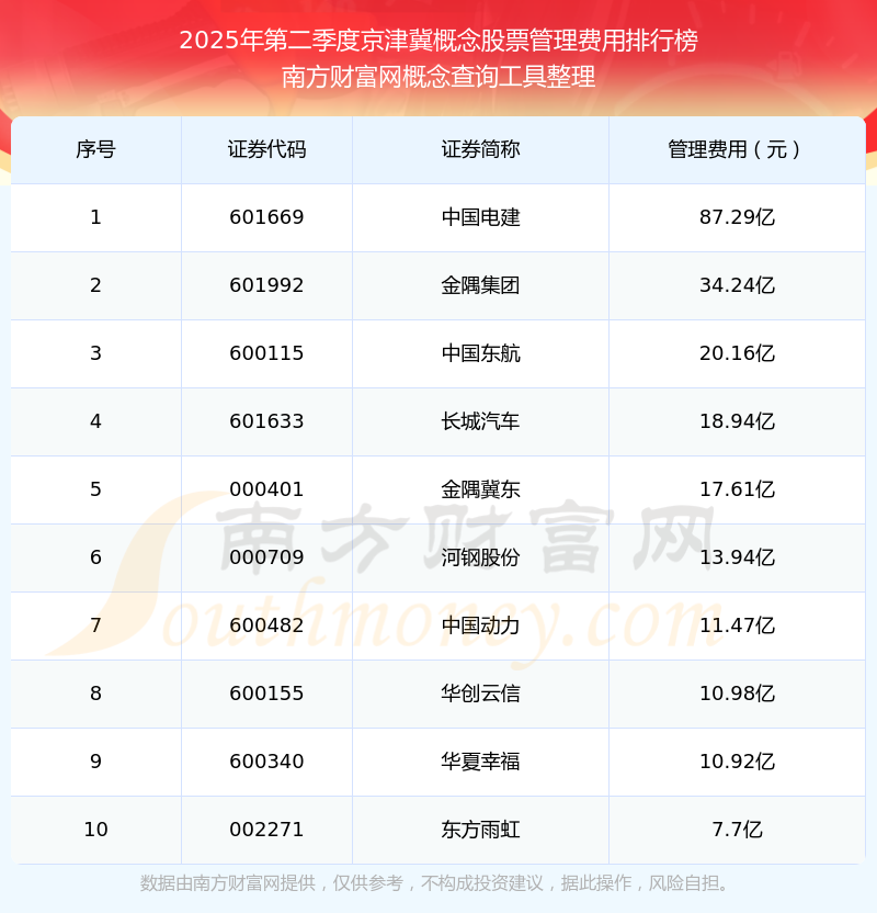 2025年第二季度,京津冀概念股票管理費用排行榜中,中國電建(601669)的管理費用總額高達87.29億,金隅集團(601992)和中國東航(600115)分別位居第二和第三,長城汽車(601633)、金隅冀東(000401)、河鋼股份(000709)、中國動力(600482)、華創(chuàng)云信(600155)、華夏幸福(600340)、東方雨虹(002271)分別進入前十,其管理費用總額分別排名第4-10名。