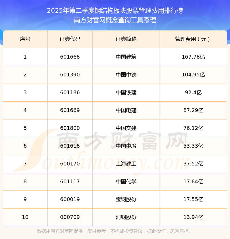 2025年第二季度,鋼結(jié)構(gòu)板塊股票管理費(fèi)用排名如下:中國建筑(601668)的管理費(fèi)用總額高達(dá)167.78億,中國中鐵(601390)和中國鐵建(601186)位居第二和第三,中國電建(601669)、中國交建(601800)、中國中冶(601618)、上海建工(600170)、中國化學(xué)(601117)、寶鋼股份(600019)、河鋼股份(000709)分別進(jìn)入前十,其管理費(fèi)用總額分別排名第4-10名。