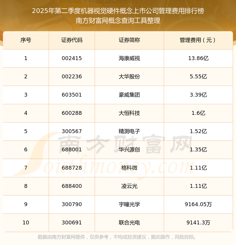 2025年第二季度,機(jī)器視覺硬件概念上市公司管理費用排行榜中,海康威視(002415)的管理費用總額高達(dá)13.86億,大華股份(002236)和豪威集團(tuán)(603501)分別位居第二和第三,大恒科技(600288)、精測電子(300567)、華興源創(chuàng)(688001)、格科微(688728)、凌云光(688400)、宇瞳光學(xué)(300790)、聯(lián)合光電(300691)分別進(jìn)入前十,其管理費用總額分別排名第4-10名。