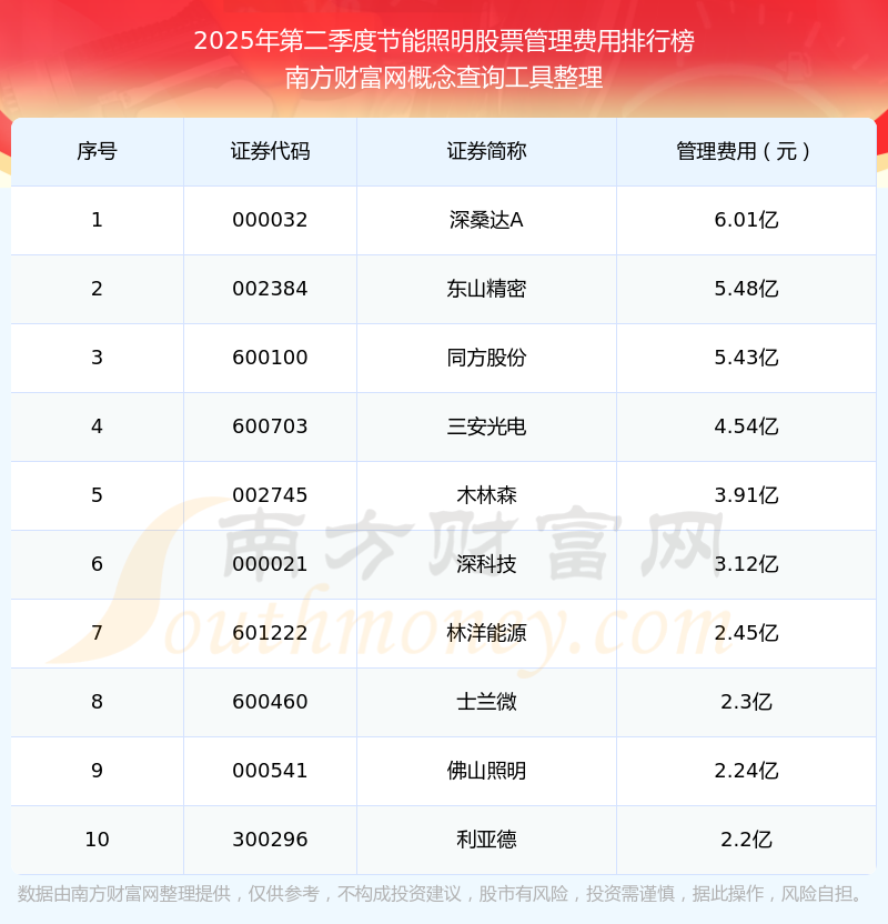 2025年第二季度,節(jié)能照明股票管理費(fèi)用排行榜如下:深桑達(dá)A(000032)的管理費(fèi)用總額高達(dá)6.01億,東山精密(002384)和同方股份(600100)分別排名第二和第三,三安光電(600703)、木林森(002745)、深科技(000021)、林洋能源(601222)、士蘭微(600460)、佛山照明(000541)、利亞德(300296)分別進(jìn)入前十,其管理費(fèi)用總額分別排名第4-10名。