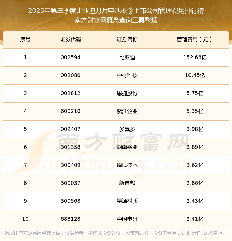 2025年第三季度,比亞迪刀片電池概念上市公司管理費(fèi)用排名中,比亞迪(002594)的管理費(fèi)用總額高達(dá)152.68億,中材科技(002080)和恩捷股份(002812)排名第二和第三,紫江企業(yè)(600210)、多氟多(002407)、湖南裕能(301358)、道氏技術(shù)(300409)、新宙邦(300037)、星源材質(zhì)(300568)、中國電研(688128)進(jìn)入前十,其管理費(fèi)用總額分別排名第4-10名。