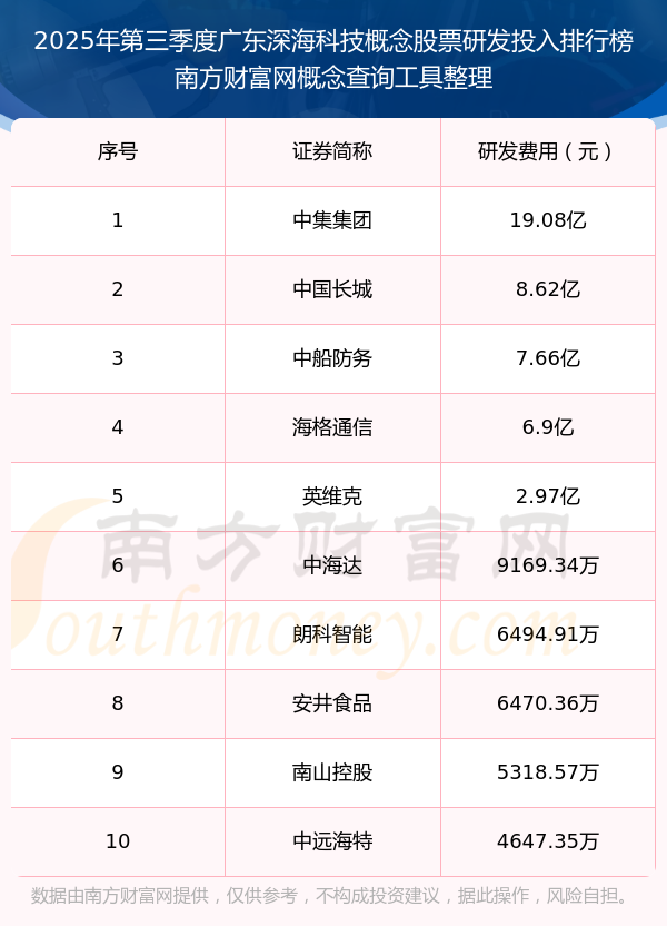 2025年第三季度廣東深?萍几拍罟善毖邪l(fā)投入排行榜如下:中集集團(tuán)(000039)研發(fā)投入總額高達(dá)19.08億,中國(guó)長(zhǎng)城(000066)和中船防務(wù)(600685)分別位居第二和第三,海格通信(002465)、英維克(002837)、中海達(dá)(300177)、朗科智能(300543)、安井食品(603345)、南山控股(002314)、中遠(yuǎn)海特(600428)分別進(jìn)入前十,其研發(fā)投入總額分別排名第4-10名。