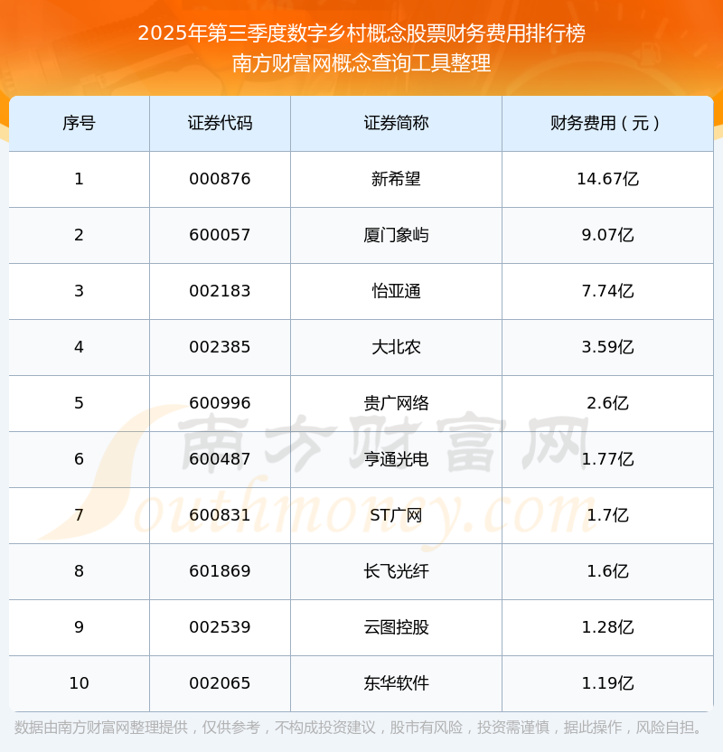 2025年第三季度,數(shù)字鄉(xiāng)村概念股票財務(wù)費(fèi)用排行榜中,新希望(000876)財務(wù)費(fèi)用總額高達(dá)14.67億,廈門象嶼(600057)和怡亞通(002183)位居第二和第三,大北農(nóng)(002385)、貴廣網(wǎng)絡(luò)(600996)、亨通光電(600487)、ST廣網(wǎng)(600831)、長飛光纖(601869)、云圖控股(002539)、東華軟件(002065)進(jìn)入前十,財務(wù)費(fèi)用總額分別排名第4-10名。