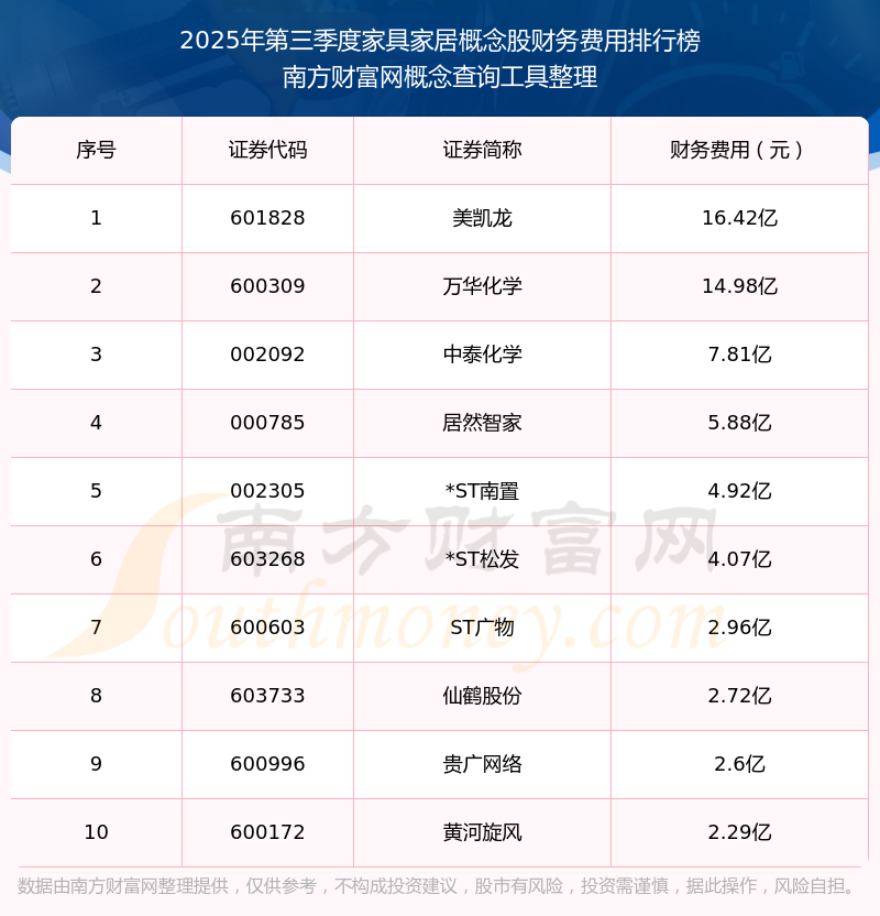 2025年第三季度,家具家居概念股財務(wù)費(fèi)用排行榜中,美凱龍(601828)財務(wù)費(fèi)用總額高達(dá)16.42億,萬華化學(xué)(600309)和中泰化學(xué)(002092)排名第二和第三,居然智家(000785)、*ST南置(002305)、*ST松發(fā)(603268)、ST廣物(600603)、仙鶴股份(603733)、貴廣網(wǎng)絡(luò)(600996)、黃河旋風(fēng)(600172)進(jìn)入前十,財務(wù)費(fèi)用總額分別排名第4-10名。