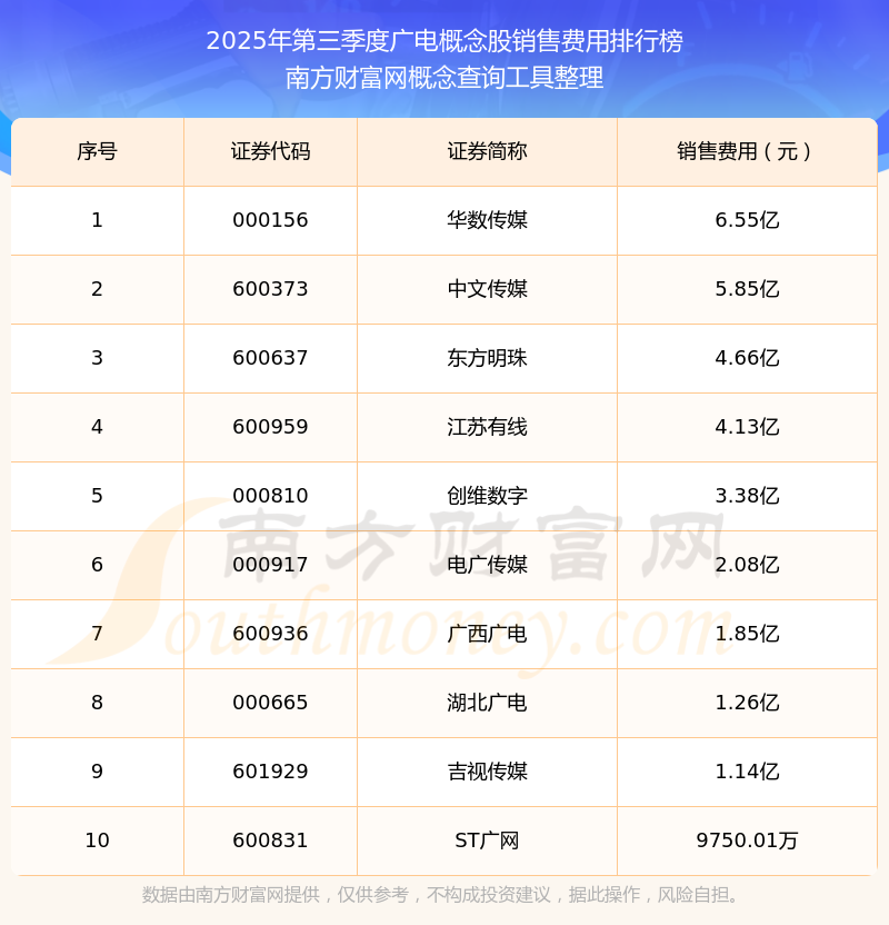 2025年第三季度廣電概念股銷售費(fèi)用排行榜如下:華數(shù)傳媒(000156)的銷售費(fèi)用總額高達(dá)6.55億,中文傳媒(600373)和東方明珠(600637)分別位居第二和第三,江蘇有線(600959)、創(chuàng)維數(shù)字(000810)、電廣傳媒(000917)、廣西廣電(600936)、湖北廣電(000665)、吉視傳媒(601929)、ST廣網(wǎng)(600831)分別進(jìn)入前十,其銷售費(fèi)用總額分別排名第4-10名。