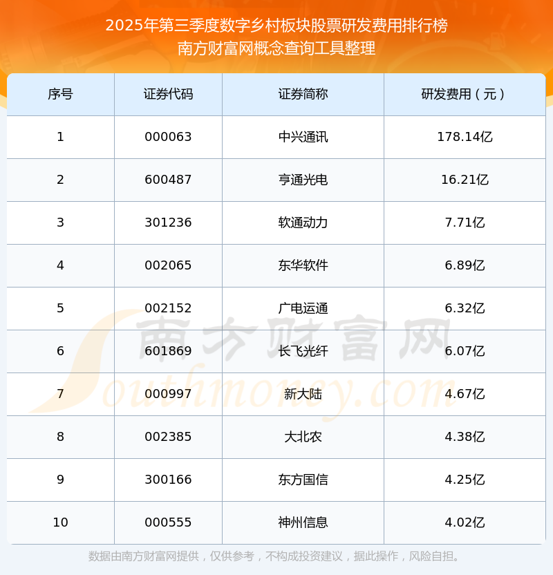 2025年第三季度,數(shù)字鄉(xiāng)村板塊股票研發(fā)費用排行榜中,中興通訊(000063)研發(fā)費用總額高達178.14億,亨通光電(600487)和軟通動力(301236)位居第二和第三,東華軟件(002065)、廣電運通(002152)、長飛光纖(601869)、新大陸(000997)、大北農(nóng)(002385)、東方國信(300166)、神州信息(000555)進入前十,研發(fā)費用總額分別排名第4-10名。