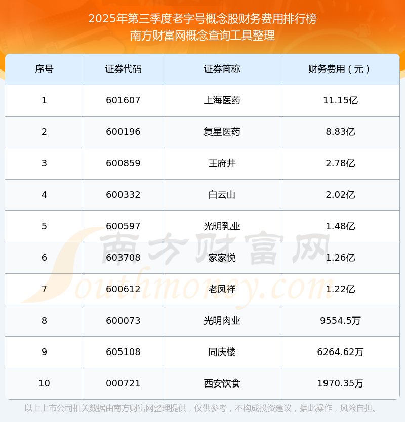 2025年第三季度,老字號概念股財務(wù)費用排行榜中,上海醫(yī)藥(601607)財務(wù)費用總額高達11.15億,復(fù)星醫(yī)藥(600196)和王府井(600859)位居第二和第三,白云山(600332)、光明乳業(yè)(600597)、家家悅(603708)、老鳳祥(600612)、光明肉業(yè)(600073)、同慶樓(605108)、西安飲食(000721)進入前十,財務(wù)費用總額分別排名第4-10名。