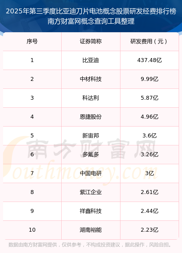 2025年第三季度,比亞迪刀片電池概念股票研發(fā)經(jīng)費(fèi)排行榜中,比亞迪(002594)研發(fā)經(jīng)費(fèi)總額高達(dá)437.48億,中材科技(002080)和科達(dá)利(002850)位居第二和第三,恩捷股份(002812)、新宙邦(300037)、多氟多(002407)、中國電研(688128)、紫江企業(yè)(600210)、祥鑫科技(002965)、湖南裕能(301358)進(jìn)入前十,研發(fā)經(jīng)費(fèi)總額分別排名第4-10名。