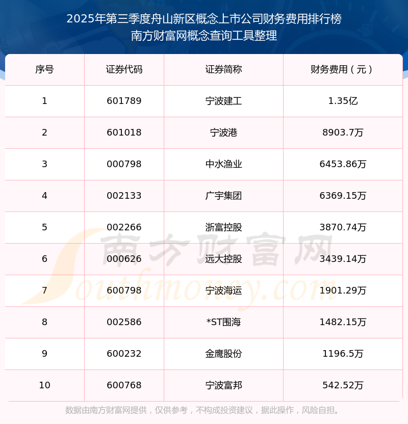 2025年第三季度舟山新區(qū)概念上市公司財務(wù)費用排行榜如下:寧波建工(601789)的財務(wù)費用總額高達1.35億,寧波港(601018)和中水漁業(yè)(000798)分別位居第二和第三,廣宇集團(002133)、浙富控股(002266)、遠大控股(000626)、寧波海運(600798)、*ST圍海(002586)、金鷹股份(600232)、寧波富邦(600768)分別進入前十,其財務(wù)費用總額分別排名第4-10名。