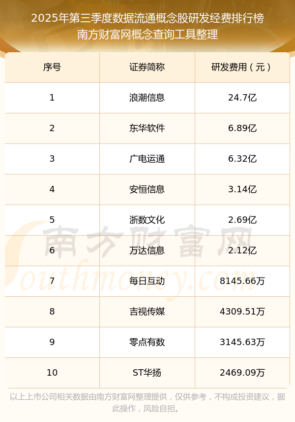 2025年第三季度,數(shù)據(jù)流通概念股研發(fā)經(jīng)費排行榜中,浪潮信息(000977)研發(fā)經(jīng)費總額高達24.7億,東華軟件(002065)和廣電運通(002152)位居第二和第三,安恒信息(688023)、浙數(shù)文化(600633)、萬達信息(300168)、每日互動(300766)、吉視傳媒(601929)、零點有數(shù)(301169)、ST華揚(603825)進入前十,研發(fā)經(jīng)費總額分別排名第4-10名。