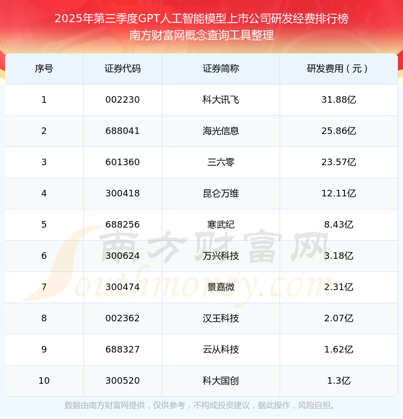 2025年第三季度,GPT人工智能模型上市公司研發(fā)經(jīng)費(fèi)排行榜中,科大訊飛(002230)研發(fā)經(jīng)費(fèi)總額高達(dá)31.88億,海光信息(688041)和三六零(601360)排名第二和第三,昆侖萬(wàn)維(300418)、寒武紀(jì)(688256)、萬(wàn)興科技(300624)、景嘉微(300474)、漢王科技(002362)、云從科技(688327)、科大國(guó)創(chuàng)(300520)進(jìn)入前十,研發(fā)經(jīng)費(fèi)總額分別排名第4-10名。