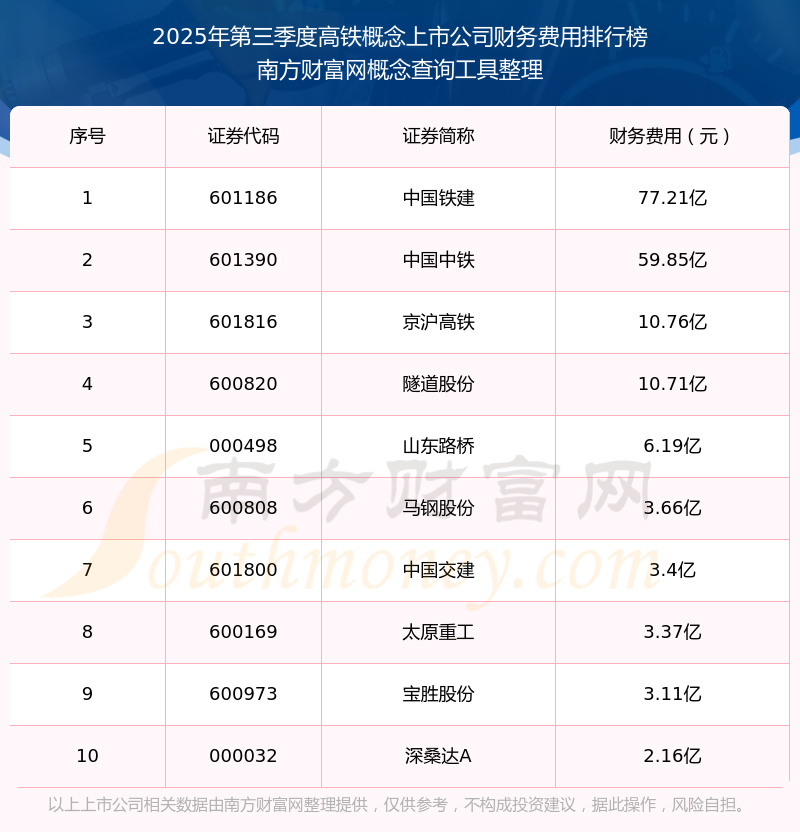 2025年第三季度高鐵概念上市公司財(cái)務(wù)費(fèi)用排行榜如下:中國鐵建(601186)的財(cái)務(wù)費(fèi)用總額高達(dá)77.21億,中國中鐵(601390)和京滬高鐵(601816)分別排名第二和第三,隧道股份(600820)、山東路橋(000498)、馬鋼股份(600808)、中國交建(601800)、太原重工(600169)、寶勝股份(600973)、深桑達(dá)A(000032)分別進(jìn)入前十,其財(cái)務(wù)費(fèi)用總額分別排名第4-10名。