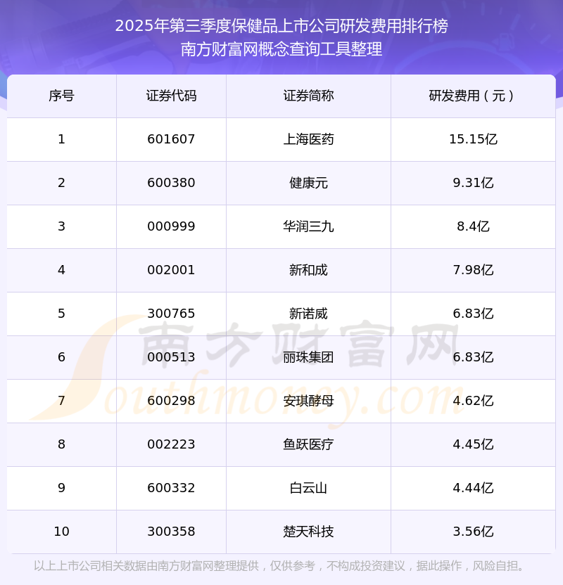 2025年第三季度保健品上市公司研發(fā)費用排行榜如下:上海醫(yī)藥(601607)研發(fā)費用總額高達15.15億,健康元(600380)和華潤三九(000999)分別排名第二和第三,新和成(002001)、新諾威(300765)、麗珠集團(000513)、安琪酵母(600298)、魚躍醫(yī)療(002223)、白云山(600332)、楚天科技(300358)分別進入前十,其研發(fā)費用總額分別排名第4-10名。