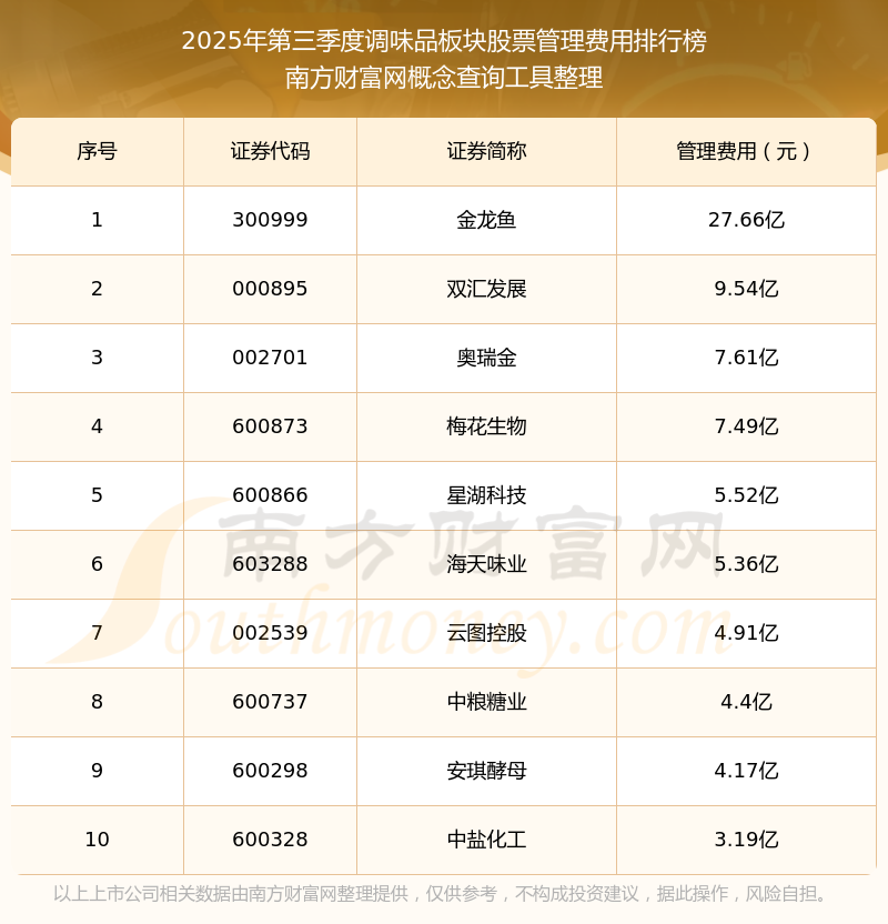 2025年第三季度,調(diào)味品板塊股票管理費(fèi)用排名如下:金龍魚(yú)(300999)的管理費(fèi)用總額高達(dá)27.66億,雙匯發(fā)展(000895)和奧瑞金(002701)位居第二和第三,梅花生物(600873)、星湖科技(600866)、海天味業(yè)(603288)、云圖控股(002539)、中糧糖業(yè)(600737)、安琪酵母(600298)、中鹽化工(600328)分別進(jìn)入前十,其管理費(fèi)用總額分別排名第4-10名。