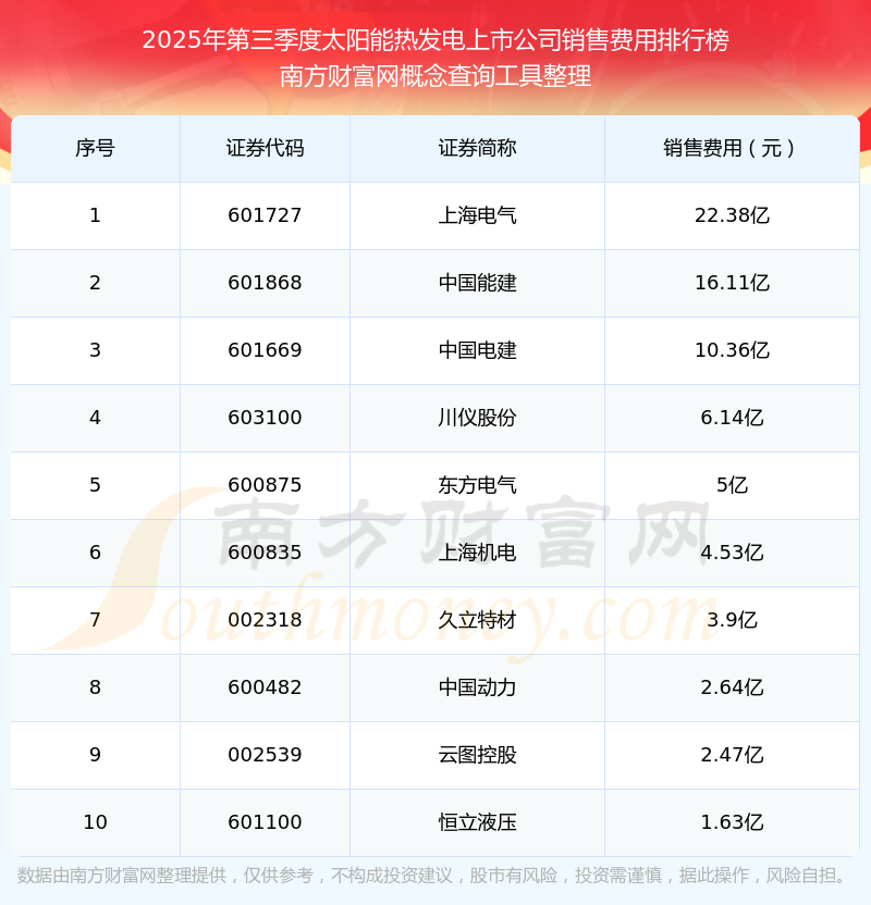 2025年第三季度,太陽(yáng)能熱發(fā)電上市公司銷(xiāo)售費(fèi)用排行榜如下:上海電氣(601727)的銷(xiāo)售費(fèi)用總額高達(dá)22.38億,中國(guó)能建(601868)和中國(guó)電建(601669)分別位居第二和第三,川儀股份(603100)、東方電氣(600875)、上海機(jī)電(600835)、久立特材(002318)、中國(guó)動(dòng)力(600482)、云圖控股(002539)、恒立液壓(601100)分別進(jìn)入前十,其銷(xiāo)售費(fèi)用總額分別排名第4-10名。