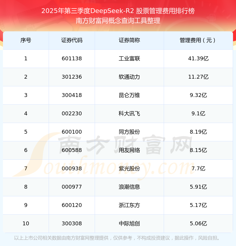 2025年第三季度,DeepSeek-R2 股票管理費用排名中,工業(yè)富聯(lián)(601138)的管理費用總額高達41.39億,軟通動力(301236)和昆侖萬維(300418)排名第二和第三,科大訊飛(002230)、同方股份(600100)、用友網絡(600588)、紫光股份(000938)、浪潮信息(000977)、浙江東方(600120)、中際旭創(chuàng)(300308)進入前十,其管理費用總額分別排名第4-10名。
