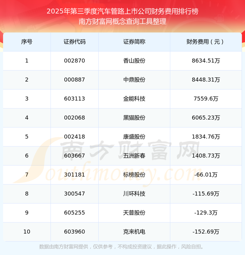 2025年第三季度汽車管路上市公司財務(wù)費用排行榜如下:香山股份(002870)的財務(wù)費用總額高達8634.51萬,中鼎股份(000887)和金能科技(603113)分別位居第二和第三,黑貓股份(002068)、康盛股份(002418)、五洲新春(603667)、標榜股份(301181)、川環(huán)科技(300547)、天普股份(605255)、克來機電(603960)分別進入前十,其財務(wù)費用總額分別排名第4-10名。