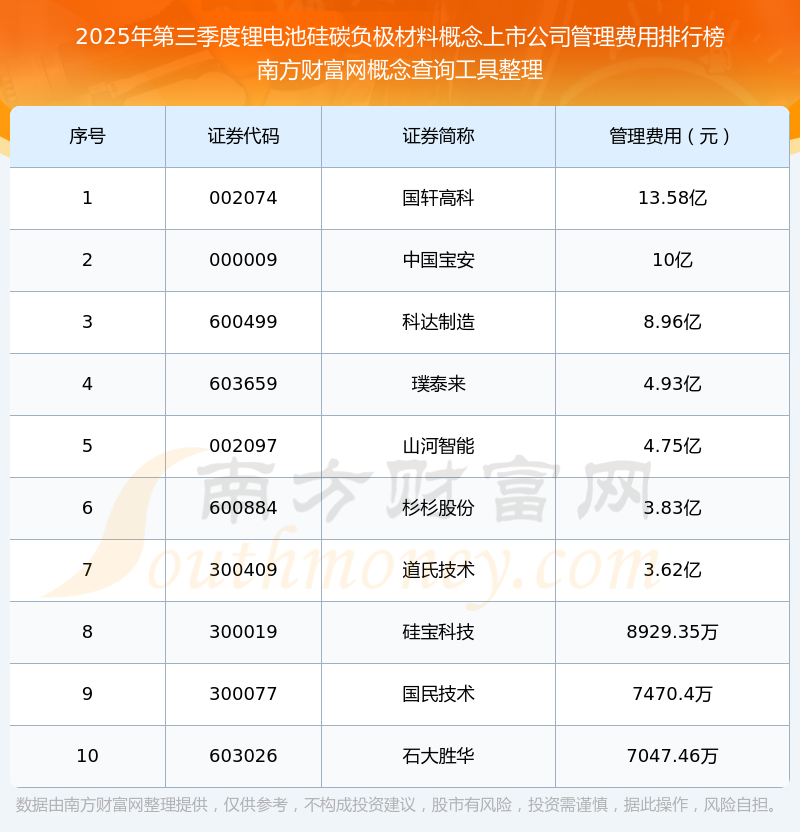 2025年第三季度,鋰電池硅碳負(fù)極材料概念上市公司管理費(fèi)用排名中,國軒高科(002074)的管理費(fèi)用總額高達(dá)13.58億,中國寶安(000009)和科達(dá)制造(600499)排名第二和第三,璞泰來(603659)、山河智能(002097)、杉杉股份(600884)、道氏技術(shù)(300409)、硅寶科技(300019)、國民技術(shù)(300077)、石大勝華(603026)進(jìn)入前十,其管理費(fèi)用總額分別排名第4-10名。