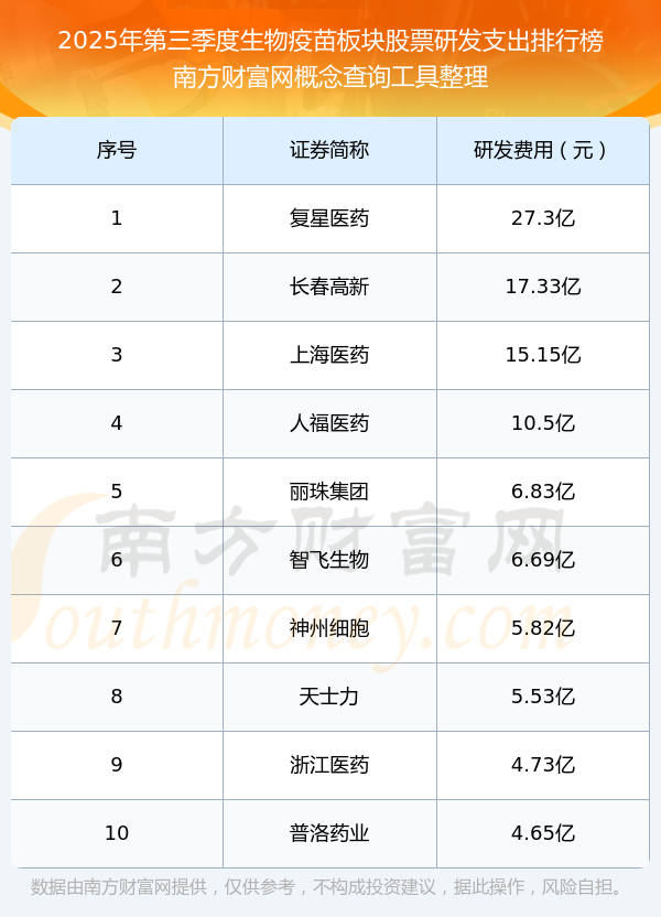 2025年第三季度生物疫苗板塊股票研發(fā)支出排行榜如下:復(fù)星醫(yī)藥(600196)研發(fā)支出總額高達27.3億,長春高新(000661)和上海醫(yī)藥(601607)分別位居第二和第三,人福醫(yī)藥(600079)、麗珠集團(000513)、智飛生物(300122)、神州細胞(688520)、天士力(600535)、浙江醫(yī)藥(600216)、普洛藥業(yè)(000739)分別進入前十,其研發(fā)支出總額分別排名第4-10名。