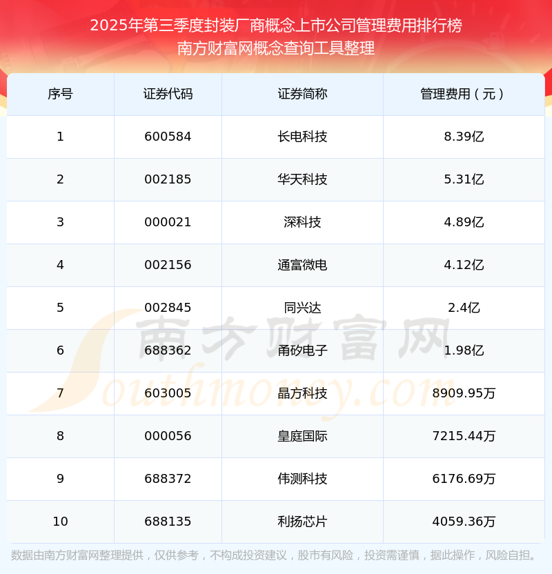 2025年第三季度,封裝廠商概念上市公司管理費(fèi)用排名中,長(zhǎng)電科技(600584)的管理費(fèi)用總額高達(dá)8.39億,華天科技(002185)和深科技(000021)排名第二和第三,通富微電(002156)、同興達(dá)(002845)、甬矽電子(688362)、晶方科技(603005)、皇庭國(guó)際(000056)、偉測(cè)科技(688372)、利揚(yáng)芯片(688135)進(jìn)入前十,其管理費(fèi)用總額分別排名第4-10名。