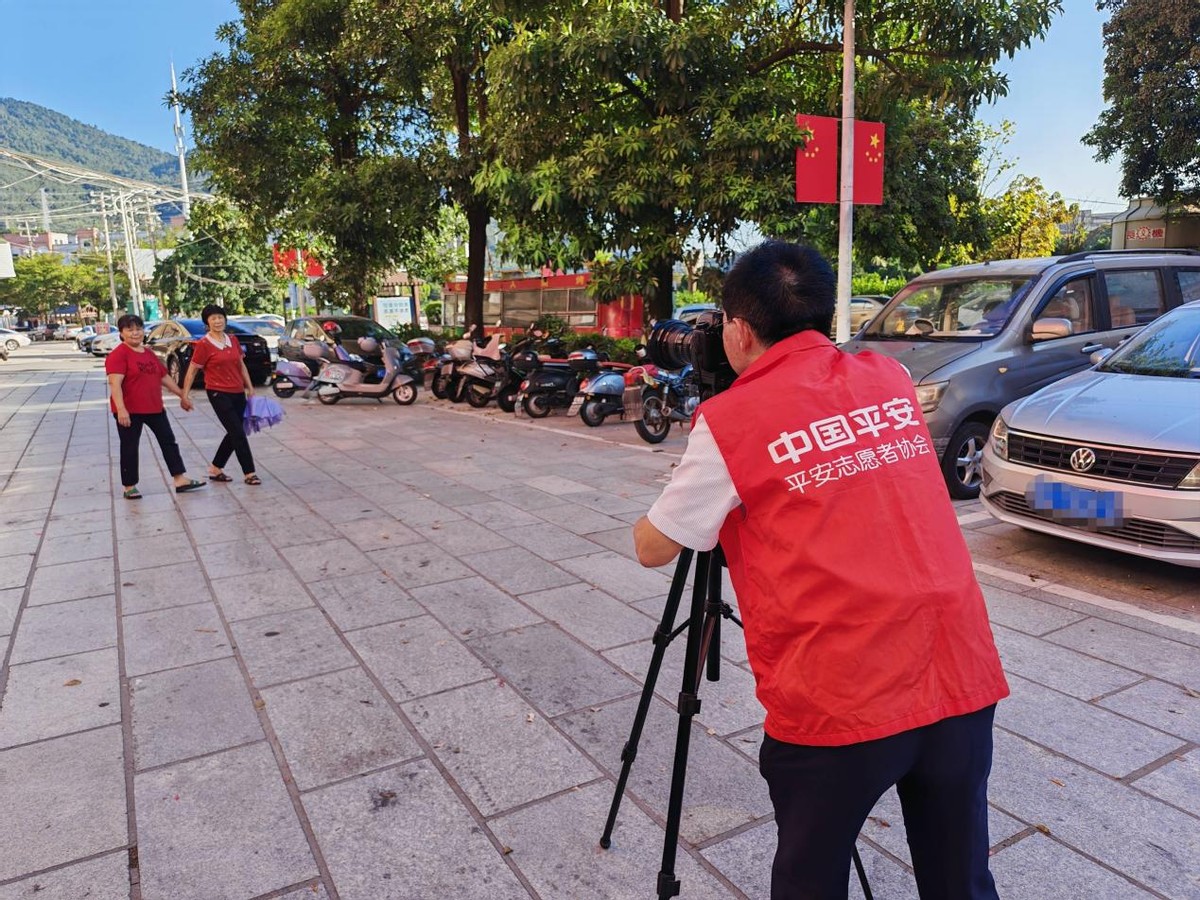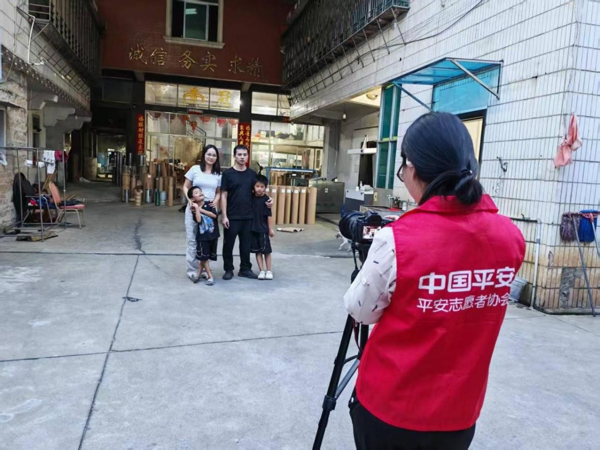 在滿山紅村的文化廣場(chǎng)上,志愿者們支起三腳架、調(diào)試好相機(jī),紅色的“中國(guó)平安 平安志愿者協(xié)會(huì)”馬甲在陽(yáng)光下格外醒目。從相攜散步的老友,到古厝前好奇張望的孩童,再到廠房外幸福依偎的四口之家……志愿者們穿梭在村落的各個(gè)角落,為不同場(chǎng)景下的村民們拍攝團(tuán)圓照。