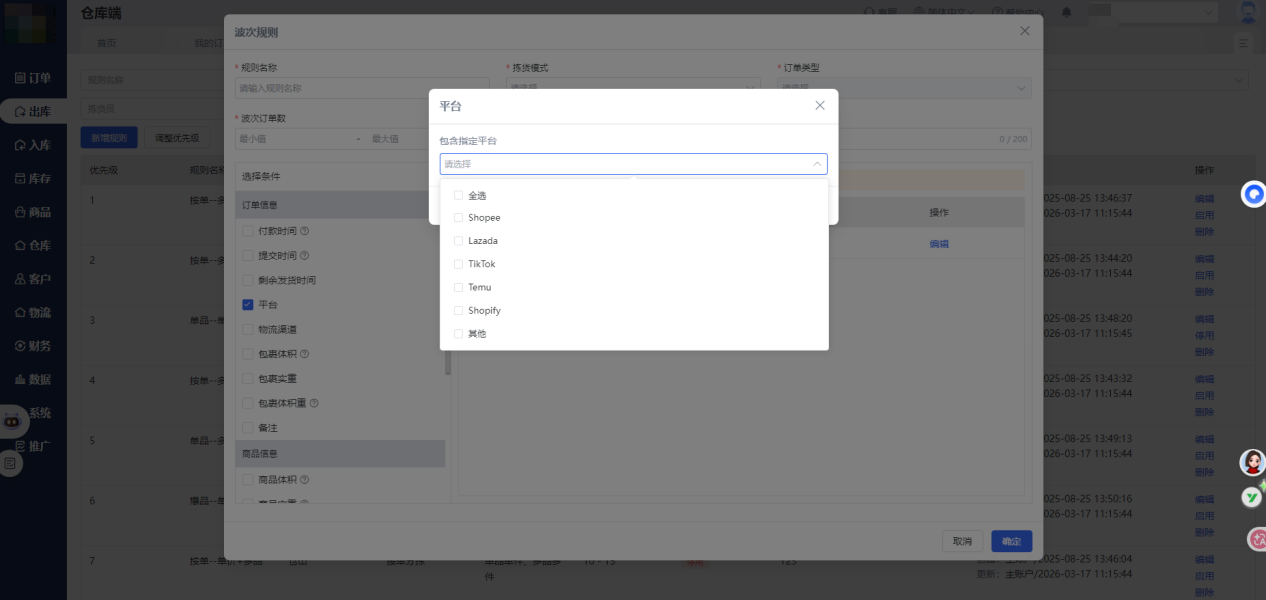 倉(cāng)庫(kù)可利用頂妙WMS波次規(guī)則功能,根據(jù)平臺(tái)、地址、SKU、分區(qū)等維度批量揀貨打包,高效應(yīng)對(duì)大促期間的訂單激增場(chǎng)景。