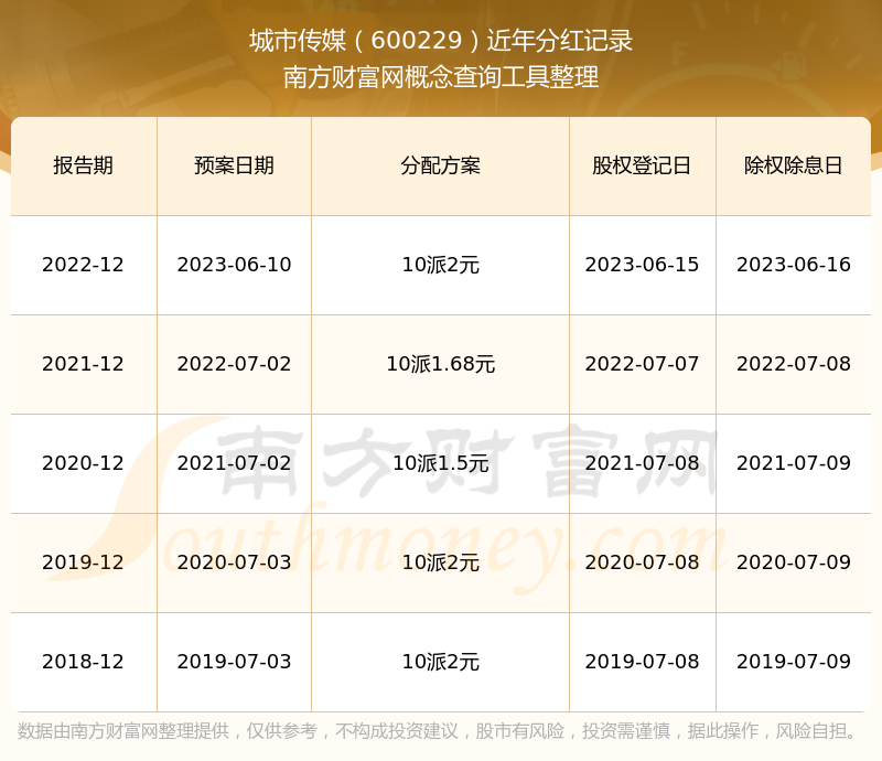 城市傳媒最新一次公布的分紅方案為10派2元。本次權益分派股權登記日為2023年6月15日,除權除息日為2023年6月16日,派息日為2023年6月16日。