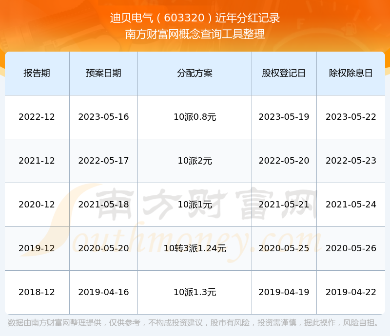 迪貝電氣最新一次公布的分紅方案為10派0.8元。本次權(quán)益分派股權(quán)登記日為2023年5月19日,除權(quán)除息日為2023年5月22日,派息日為2023年5月22日。