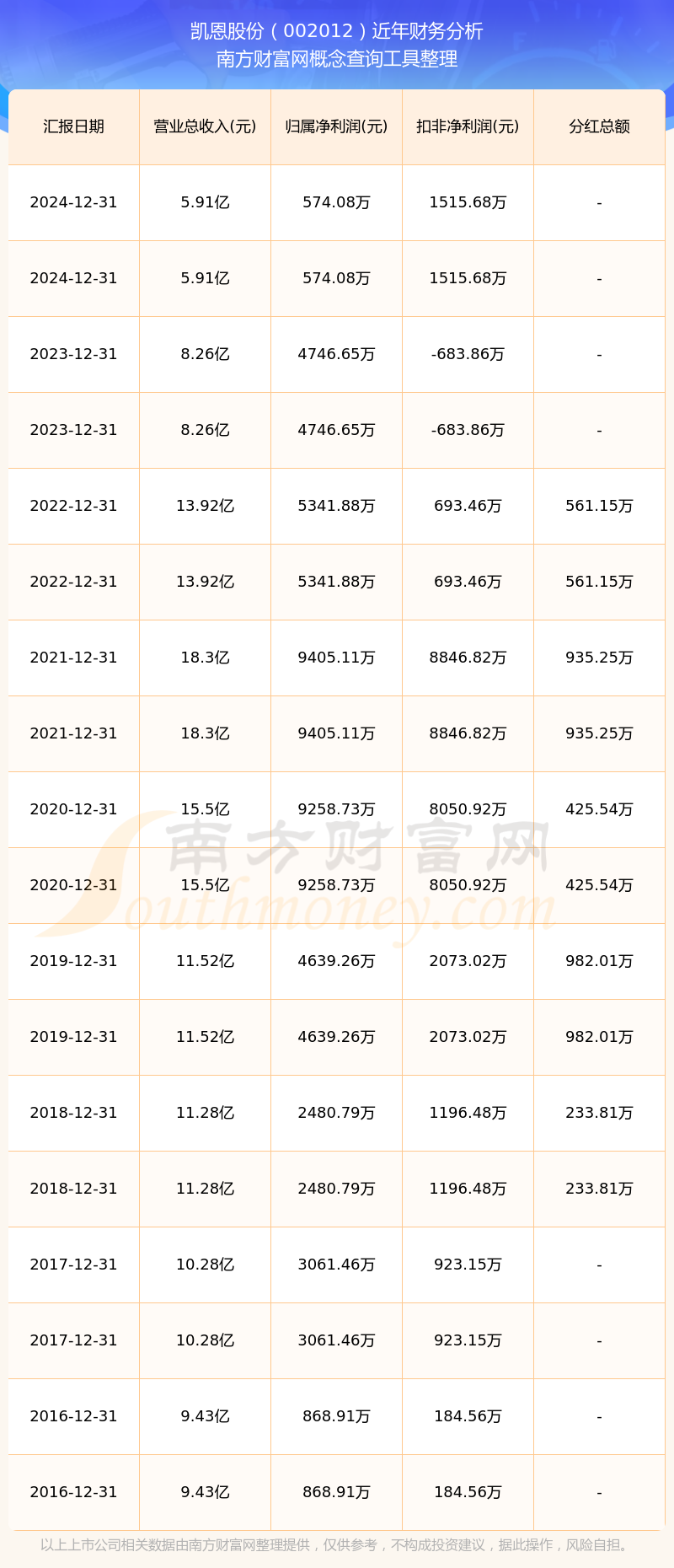凱恩股份歷年分紅派息情況如下表所示: