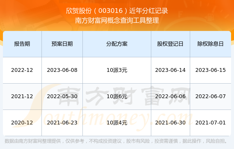 欣賀股份最新一次公布的分紅方案:10派3元。
