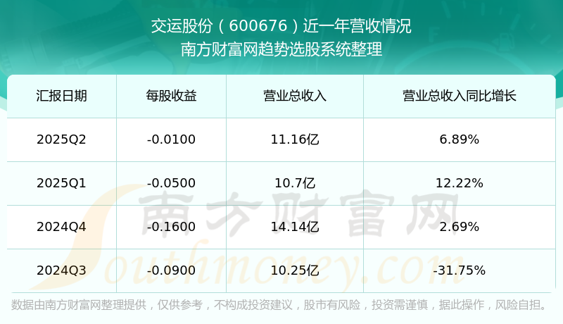 交運(yùn)股份(600676)披露2025年第二季度報(bào)告,報(bào)告期實(shí)現(xiàn)營(yíng)收11.16億元,同比6.89%;歸母凈利潤(rùn)-700.56萬(wàn)元,同比88.36%;扣非凈利潤(rùn)-5866.58萬(wàn)元,同比15.72%。