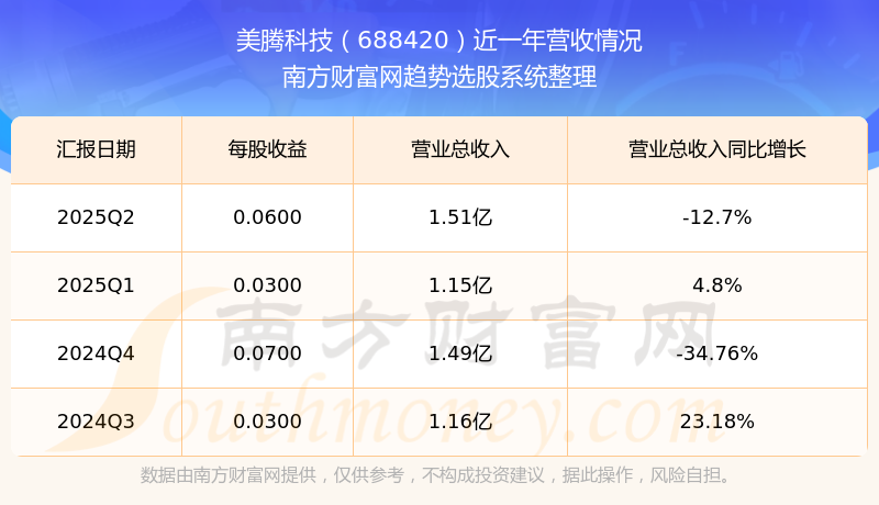 按照南方財(cái)富網(wǎng)概念查詢工具統(tǒng)計(jì),該股所屬板塊為智能裝備板塊,該板塊共有67只股票,美騰科技2025第二季度營(yíng)收在該板塊中排名為第67名,該板塊2025第二季度營(yíng)收排名前十的股票如下表: