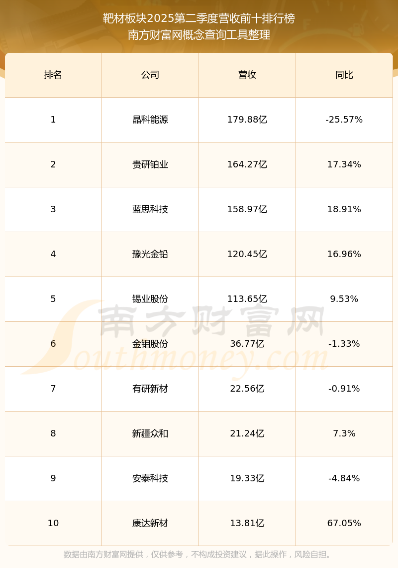 按照南方財(cái)富網(wǎng)概念查詢工具統(tǒng)計(jì),該股所屬板塊為靶材板塊,該板塊共有17只股票,歐萊新材2025第二季度營(yíng)收在該板塊中排名為第16名,該板塊2025第二季度營(yíng)收排名前十的股票如下表: