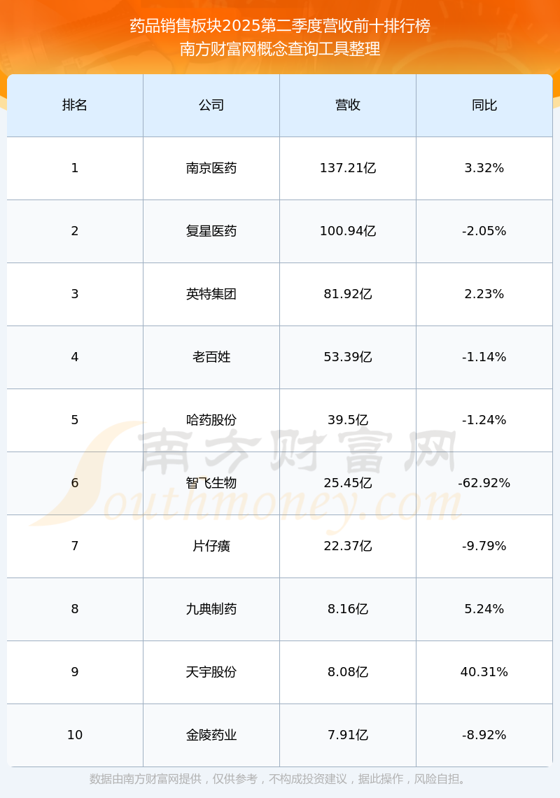 按照南方財(cái)富網(wǎng)概念查詢工具統(tǒng)計(jì),該股所屬板塊為藥品銷售板塊,該板塊共有18只股票,匯宇制藥2025第二季度營(yíng)收在該板塊中排名為第18名,該板塊2025第二季度營(yíng)收排名前十的股票如下表: