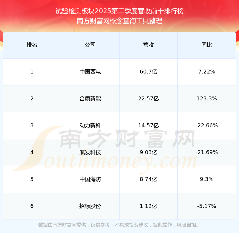 按照南方財富網(wǎng)概念查詢工具統(tǒng)計,該股所屬板塊為試驗檢測板塊,該板塊共有6只股票,南網(wǎng)科技2025第二季度營收在該板塊中排名為第6名,該板塊2025第二季度營收排名前十的股票如下表: