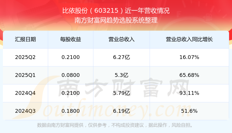 比依股份2025年第二季度公司實(shí)現(xiàn)營(yíng)業(yè)收入6.27億元,同比16.07%;歸母凈利潤(rùn)3870.07萬(wàn)元,同比-33.13%。