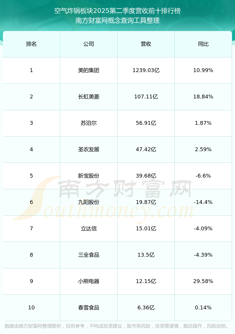 按照南方財(cái)富網(wǎng)概念查詢工具統(tǒng)計(jì),該股所屬板塊為空氣炸鍋板塊,該板塊共有17只股票,比依股份2025第二季度營(yíng)收在該板塊中排名為第11名,該板塊2025第二季度營(yíng)收排名前十的股票如下表: