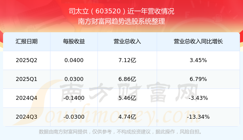 2025年第二季度,司太立營收同比3.45%,凈利潤同比39.33%。