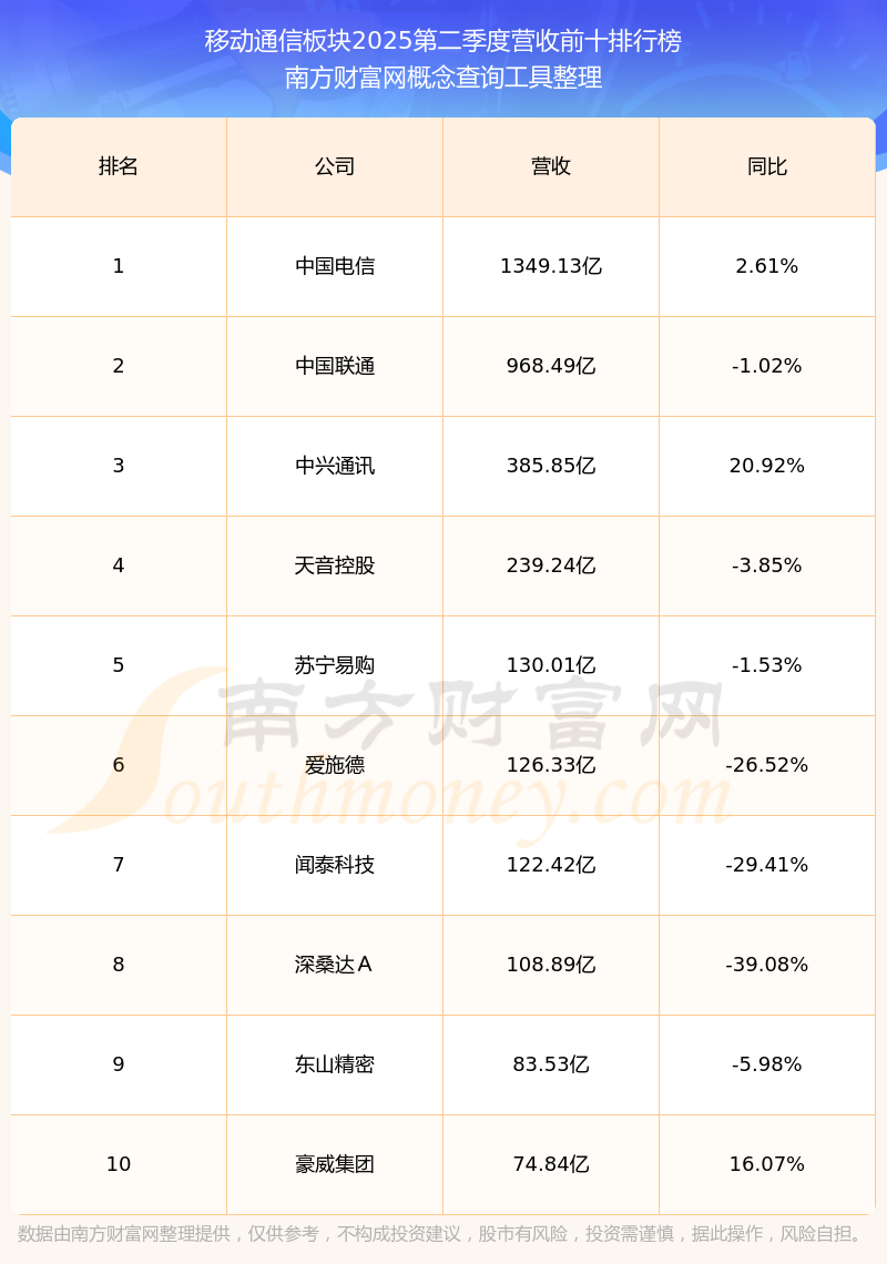 按照南方財富網(wǎng)概念查詢工具統(tǒng)計,該股所屬板塊為移動通信板塊,該板塊共有105只股票,信科移動2025第二季度營收在該板塊中排名為第105名,該板塊2025第二季度營收排名前十的股票如下表: