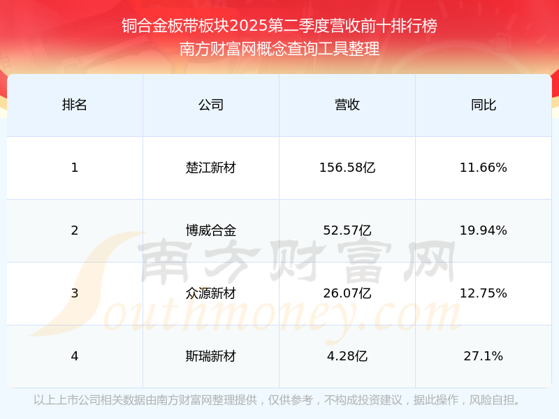 按照南方財富網(wǎng)概念查詢工具統(tǒng)計,該股所屬板塊為銅合金板帶板塊,該板塊共有4只股票,鑫科材料2025第二季度營收在該板塊中排名為第4名,該板塊2025第二季度營收排名前十的股票如下表: