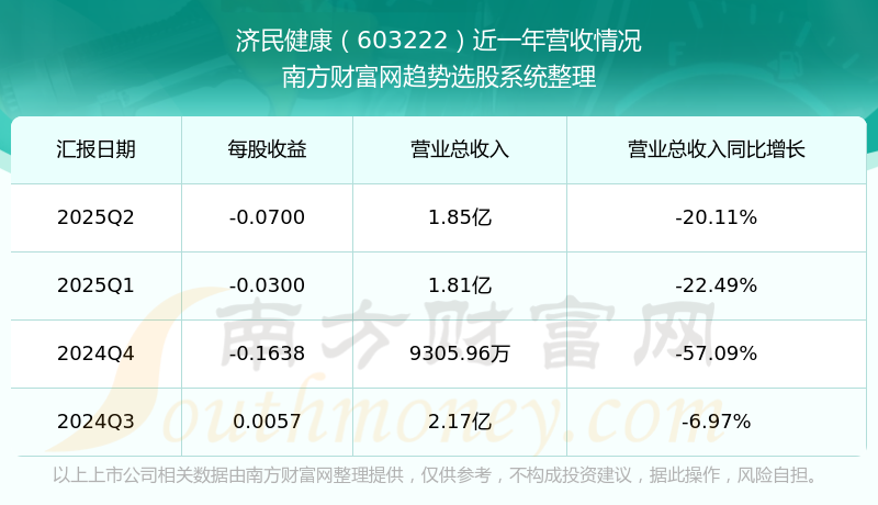 濟(jì)民健康發(fā)布2025年第二季度財報。實現(xiàn)總營收1.85億元,同比增長-20.11%;扣非凈利潤同比增長-470.9%至-3965.19萬元。