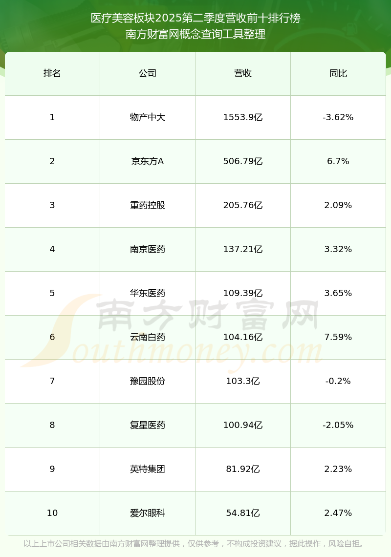 按照南方財富網(wǎng)概念查詢工具統(tǒng)計,該股所屬板塊為醫(yī)療美容板塊,該板塊共有106只股票,濟(jì)民健康2025第二季度營收在該板塊中排名為第84名,該板塊2025第二季度營收排名前十的股票如下表: