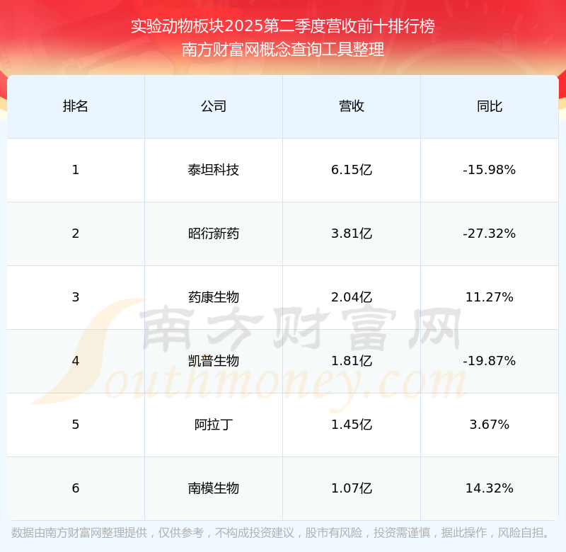 按照南方財(cái)富網(wǎng)概念查詢工具統(tǒng)計(jì),該股所屬板塊為實(shí)驗(yàn)動(dòng)物板塊,該板塊共有6只股票,藥康生物2025第二季度營收在該板塊中排名為第3名,該板塊2025第二季度營收排名前十的股票如下表:
