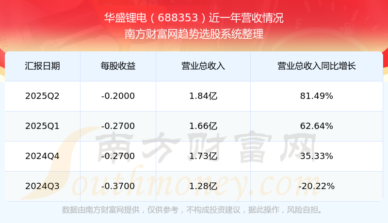 A股上市公司華盛鋰電(代碼:688353)發(fā)布2025年第二季度財報,公司2025年第二季度歸屬于上市公司股東的凈利潤為-2965.61萬元,凈利潤同比增長50.34%,環(huán)比增長31.16%。